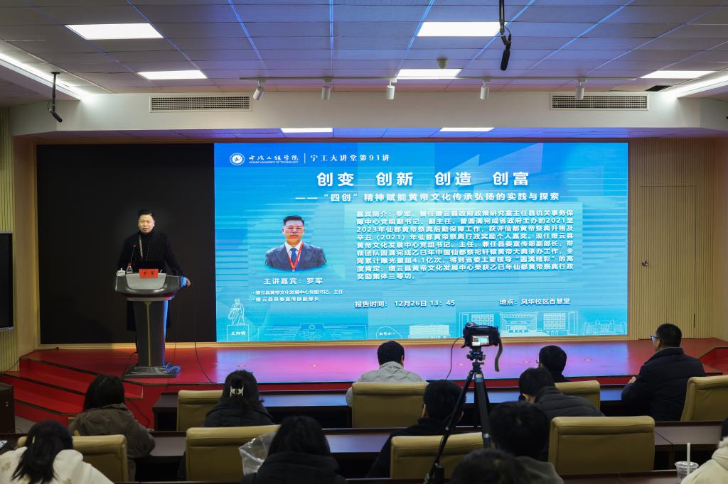 校园新闻网讯 “客从何处来?”当我们追问起中华文明的源头,轩辕黄帝始终是绕不开的重要符号。这位被尊为中华民族人文初祖的传奇人物,其身影既镌刻在典籍史册的字里行间,也烙印在华夏大地的文化遗存中,更流淌在世代传承的精神血脉里。12月26日,缙云县黄帝文化发展中心党组书记、主任兼县委宣传部副部长罗军受邀来到宁波工程学院“宁工大讲堂”,以“创变 创新 创造 创富——‘四创’精神赋能黄帝文化传承弘扬的实践与探索...