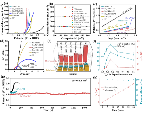催化剂在1 M KOH中的电催化OER性能:(a)不同样品在5 mV s⁻¹扫描速率下的线性扫描伏安(LSV)曲线;(b) R-NiFe-LDH与文献典型催化剂在1 M KOH中100、300和500 mA cm⁻²电流密度下的过电位对比;(c)对应塔菲尔斜率图;(d) 1.5 V电位下的奈奎斯特阻抗谱;(e)不同样品的过电位、塔菲尔斜率、电荷转移电阻(Rct)及双电层电容(Cdl)参数汇总;(f) Fe²⁺/Fe比例调控对R-NiFeₓ-LDH在400 mA cm⁻²过电位及η=300 mV时转换频率(TOF)的影响(x代表前驱体沉积液中Fe³⁺浓度);(g)泡沫镍负载的R-NiFe-LDH、NiFe-LDH及商用RuO₂在500 mA cm⁻²下的计时电位曲线;(h) R-NiFe-LDH的OER法拉第效率。