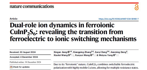 近日,我校微纳研究院团队在《NatureCommunications》发表了题为“Dual-role ion dynamics in ferroionicCuInP2S6: revealing the transition from ferroelectric to ionic switching mechanisms”的研究论文。值得一提的是,这是我校作为第一单位首次在《Nature Communications》上发表学术论文。论文链接:https://www.nature.com/articles/s41467-024-55160-7